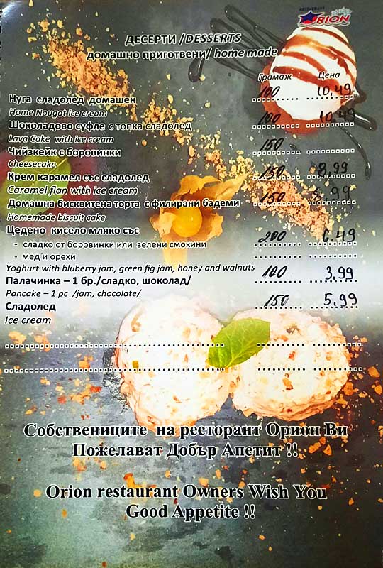 Restaurant ORION offers home-cooked, tasty and fresh fish, seafood specialties and appetizers, vegetable dishes prepared according to unique recipes of the chef, a rich menu from the Bulgarian national cuisine, meat and grilled dishes prepared from fresh meat and vegetables, and finally the unique home-made desserts by the chef.